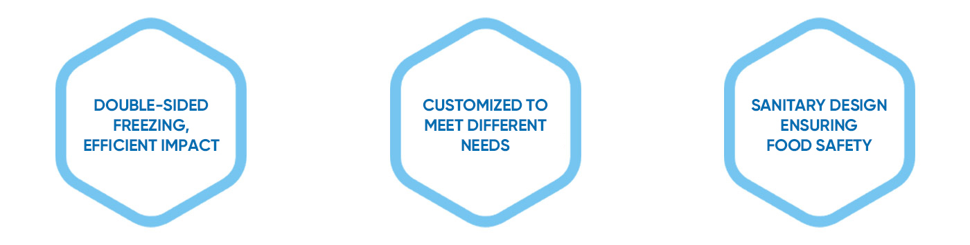 The Brine plate-Quick Freezer conveyor usesimported high-strength stainless steel strips, which have good elasticity, high rigidity, and are not easyto deform. The transmission motor uses variablefrequency stepless speed regulation. lt is equipped with a down-blowing device,which greatly improves the heat exchange effect of the lower surface of the strip.Since the food is generally close to the strip, the freezing time is shortened.The plate-belt single freezer has little effect on theappearance of the food and has no mesh marks. lt is particularly suitable for large and thin products.